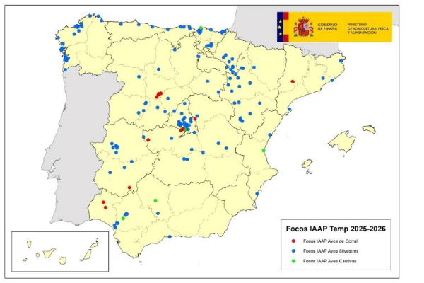 Adicionalmente, desde el inicio de la actual temporada (que comenzó el 1 de julio 2025) y hasta ahora se han detectado 5 focos en aves cautivas (en País Vasco, Andalucía, Comunidad Valenciana y Madrid), 1 foco en aves de autoconsumo en Madrid y 151 focos en aves silvestres en todas las Comunidades autónomas excepto en Murcia y las Islas Baleares y Canarias.